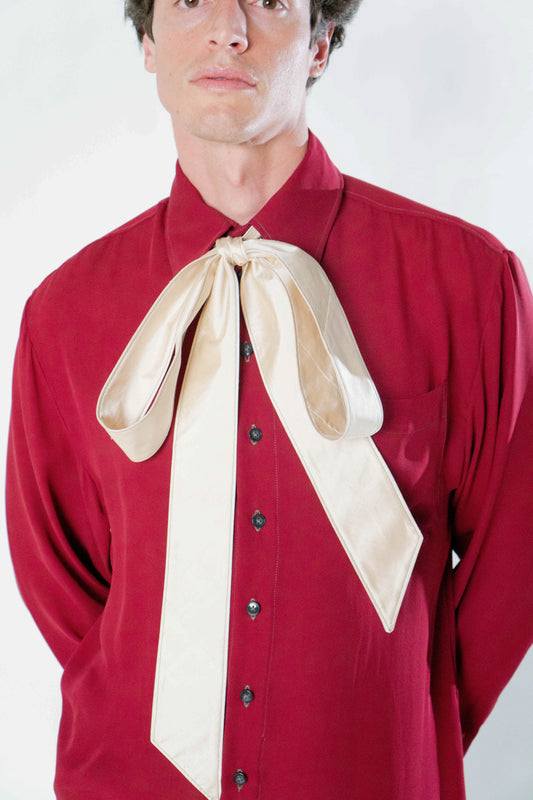 Fita-Laço em Cetim Duplo de Seda Off-White Bordado em Linha com Formas Orgânicas