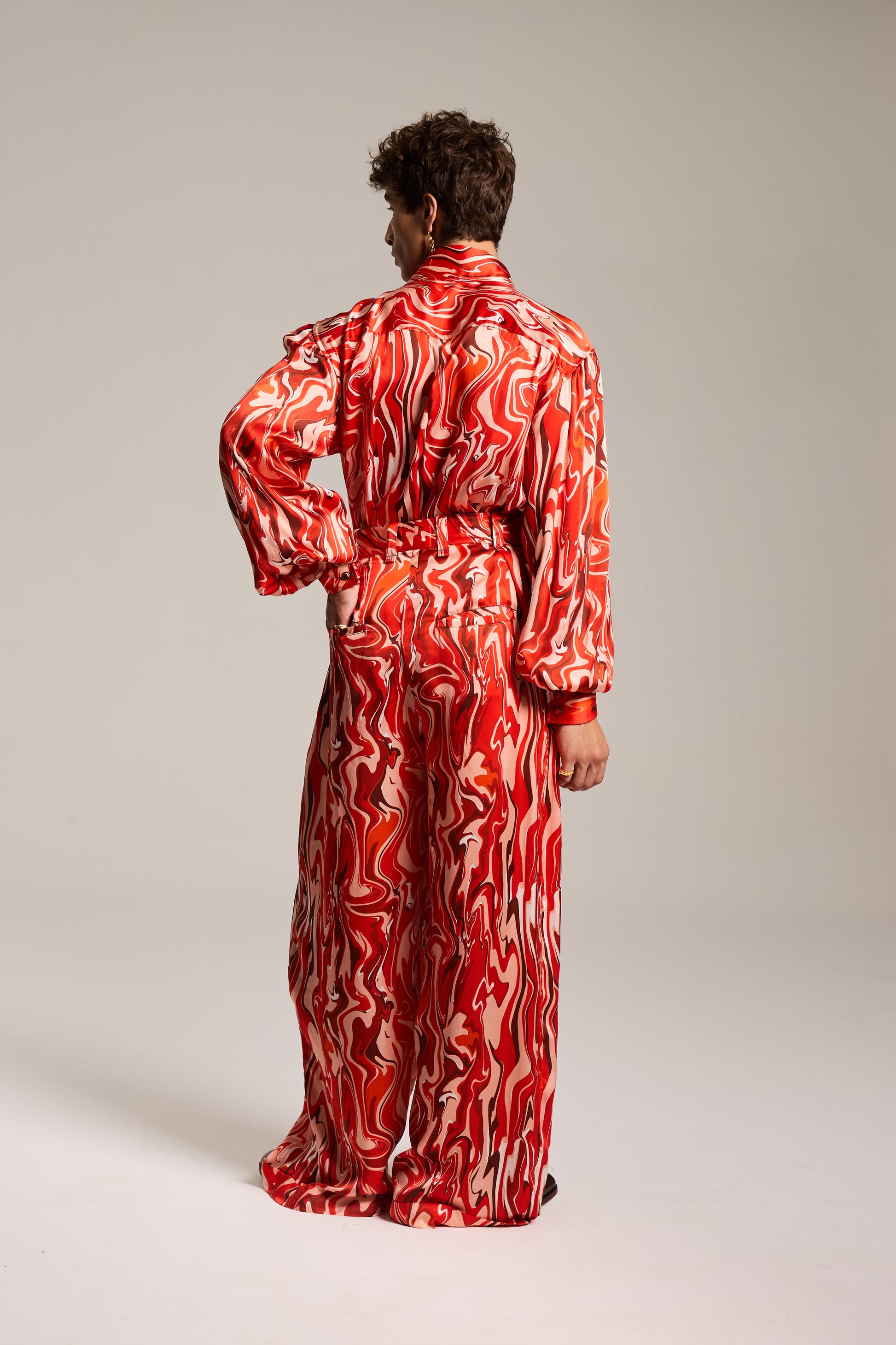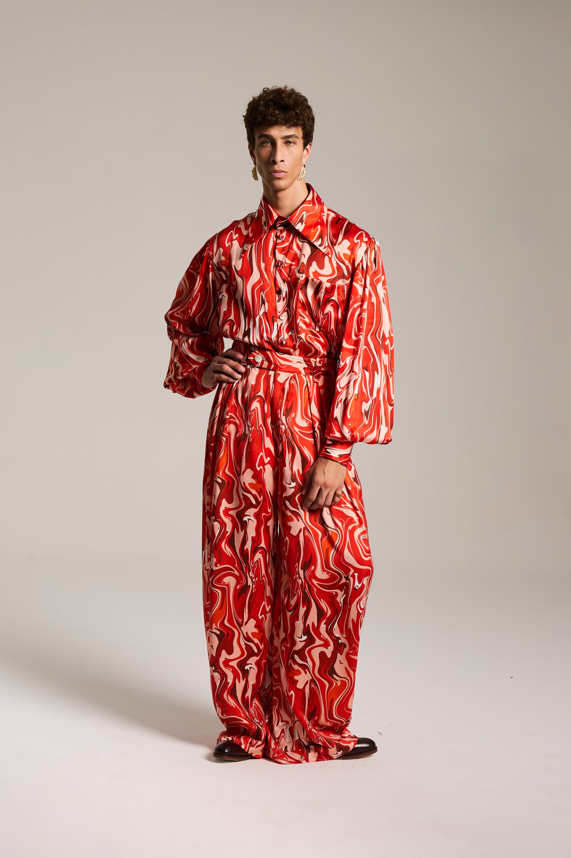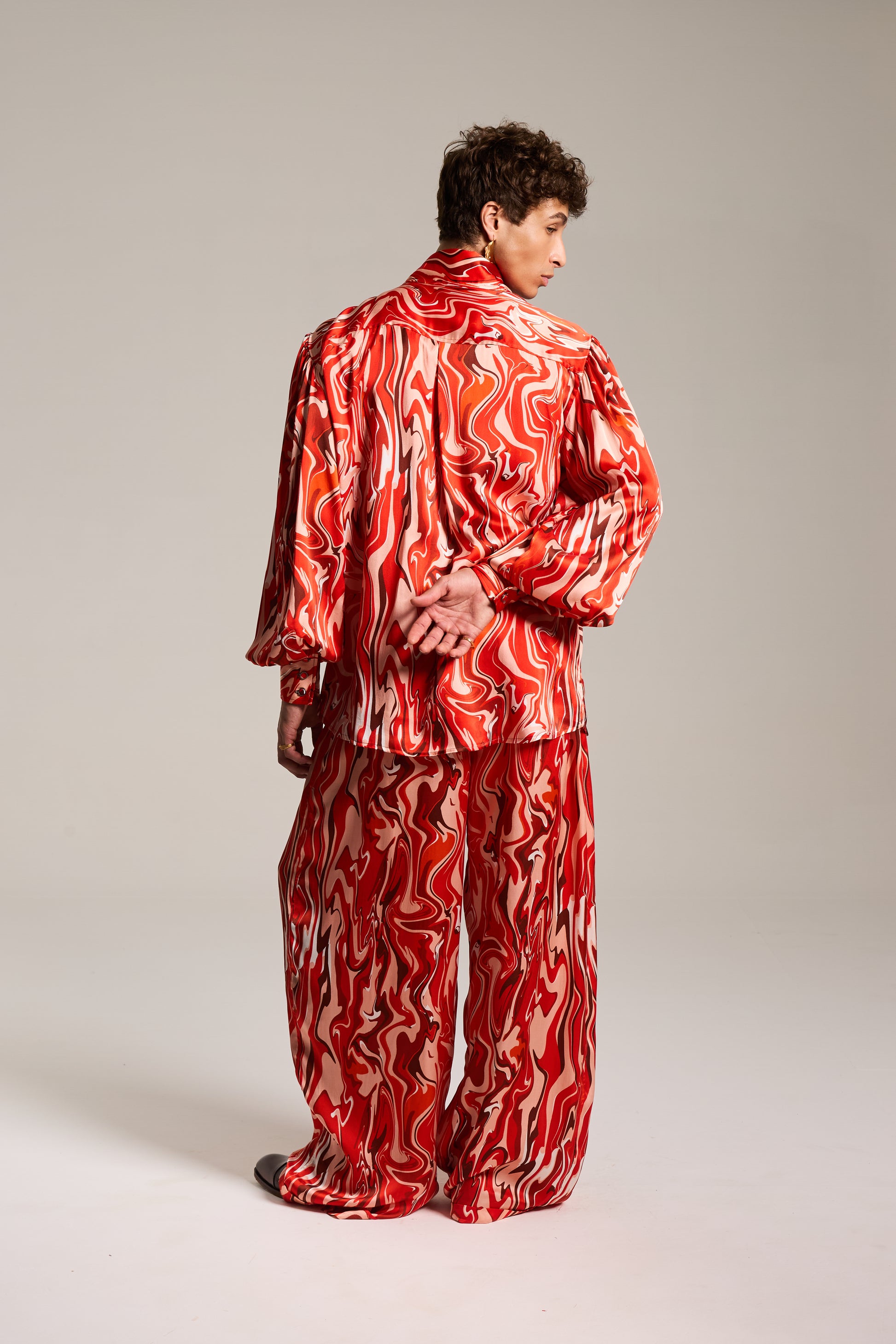 Camisa de Seda com Mangas Bufantes estampada em Mármore Sanguíneo Pulsante